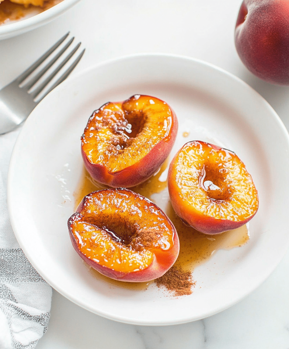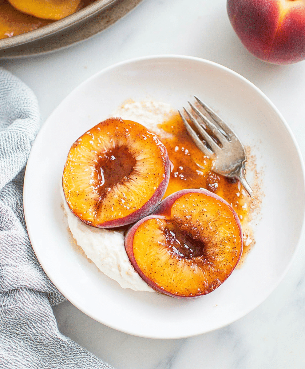 A sprinkle of ground cinnamon brings warmth and spice, perfectly complementing the fruit. The combination of cinnamon and baked peach is cozy and nostalgic—like peach cobbler without the crust.